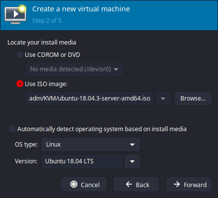 Use ISO image: /home/hostadm/KVM/ubuntu-18.04.5-server-amd64.iso
