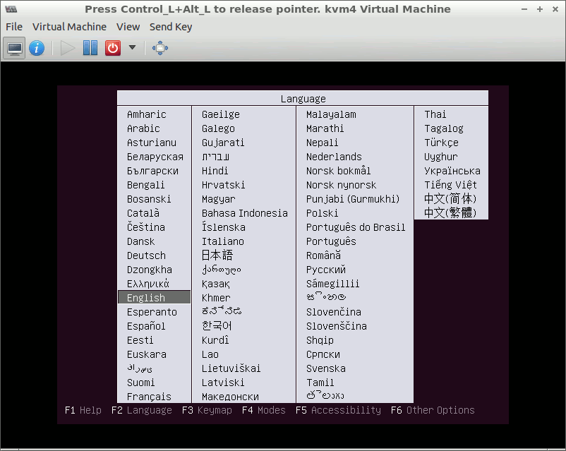 Click onto kvm1 in the KVM manager. It will bring up a virtual console for the VM with the installer running. After accepting ‘English Language’, press F4, which stands for “Modes” in the installer bottom menu line, and scroll down to “Install a minimal virtual machine” selection, press ENTER: