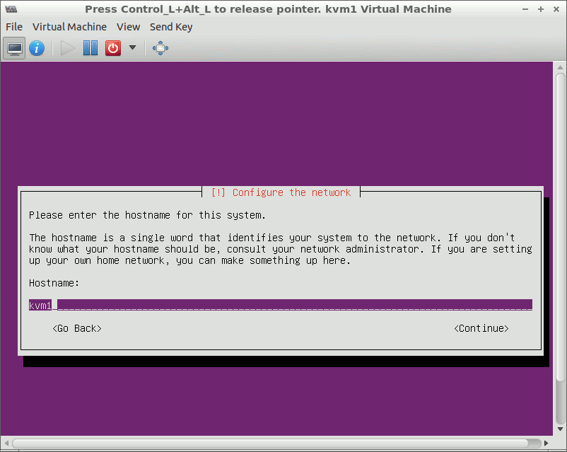 Choose language: English, United States. Choose ‘No’ for detecting keyboard layout, USA for the origin of the keyboard, USA for keyboard layout. In ‘Configure the network’ menu, set ‘kvm1’: