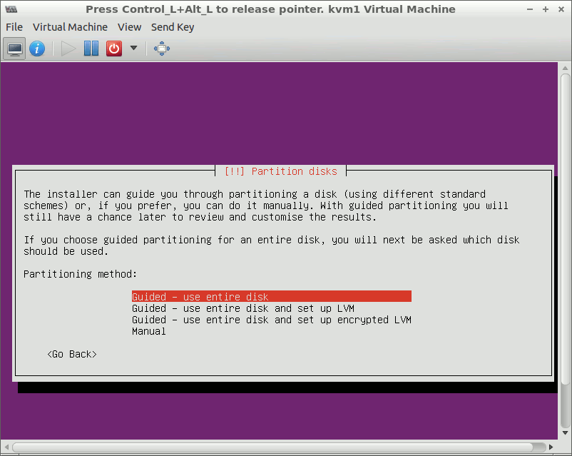 In the partition disks menu, select ‘Guided - use entire disk’ partitioning method.