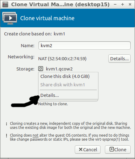 Launch virt-manager. Right click onto kvm1 and select to “clone”.